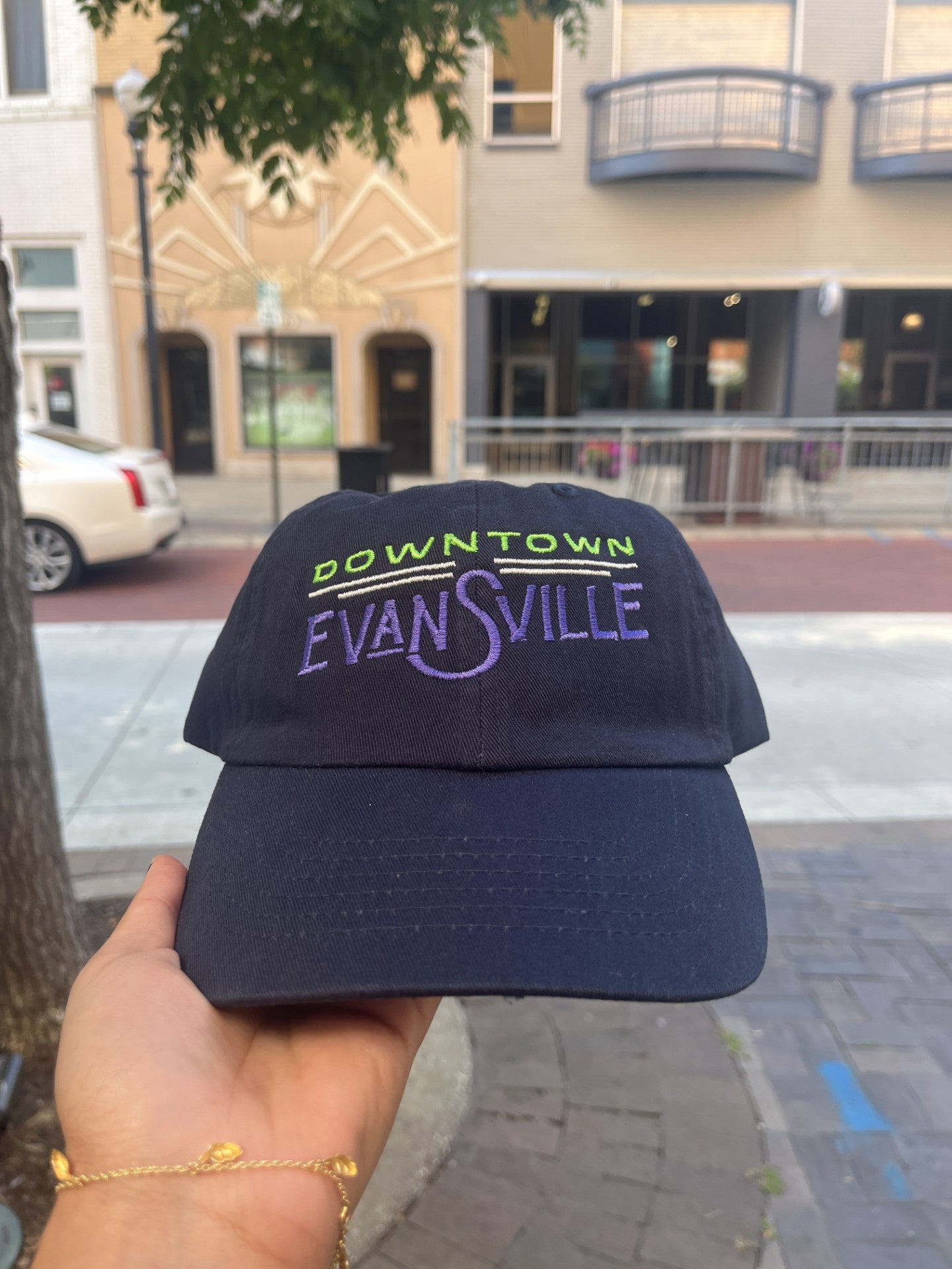 Represent Evansville in style with our Downtown Evansville Dad Hat! The hat features an embroidered "Downtown Evansville" on the front and an adjustable closure in the back. The hats are available in navy and black.